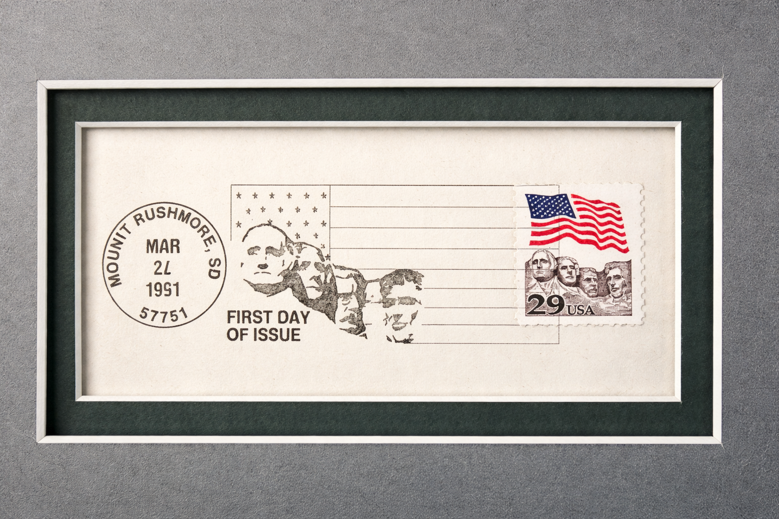 A First Day Issue Cancelled Stamp from the United States Postal Service celebrating 50th anniversary of the completion of MT. Rushmore.