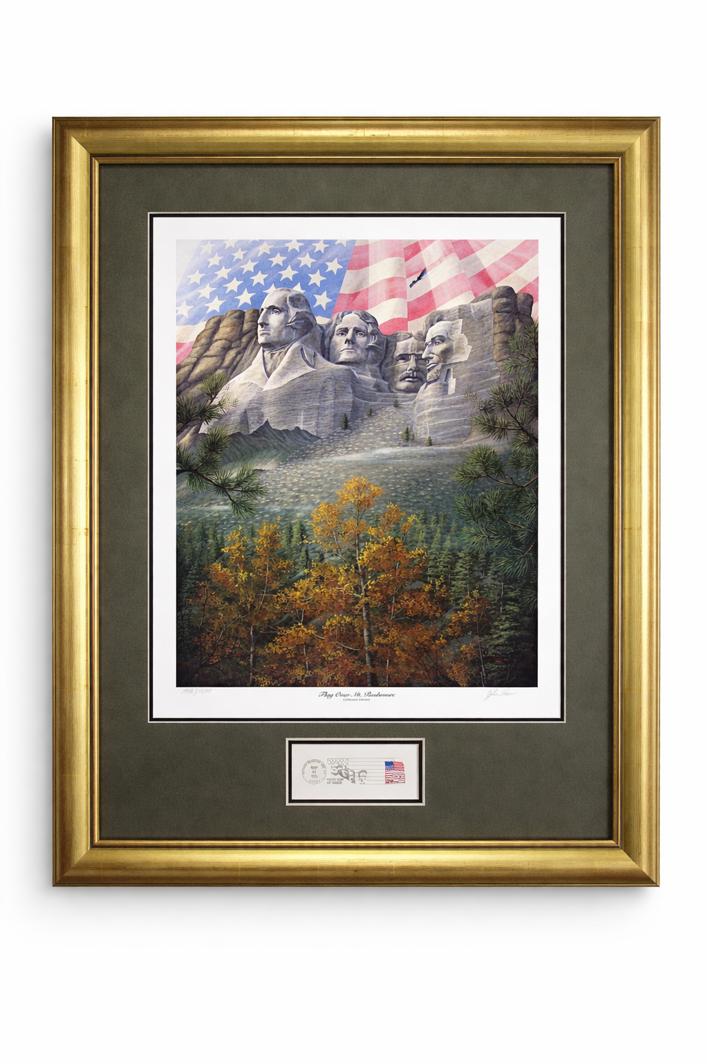 Flag Over Mt.Rushmore Lithograph by John Shaw and First Day Cancelled Stamp from The U.S Postal Service Celebrating The 50Th Anniversary of The Completion of Mt.Rushmore.